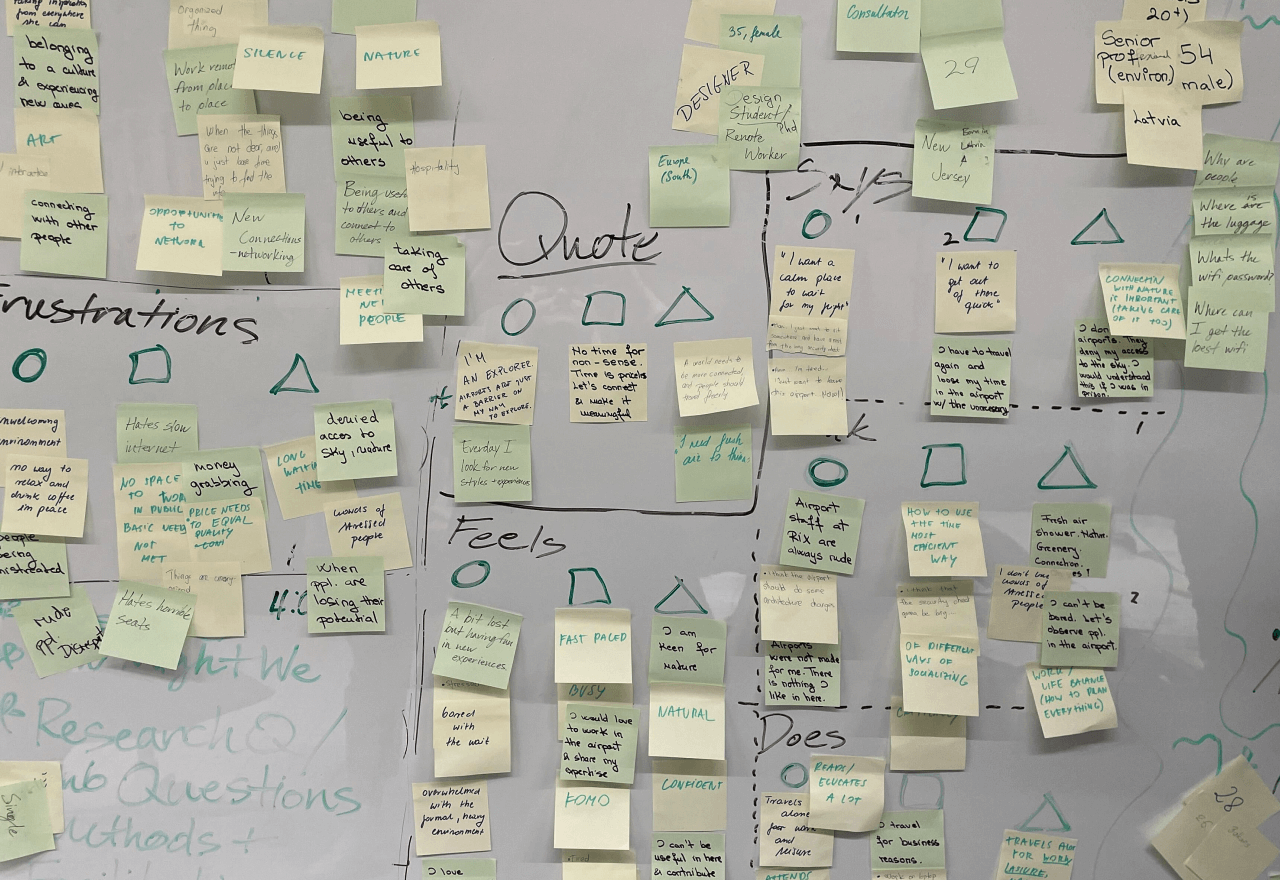 We began with secondary research, analysing airport performance reports and travel trends, followed by qualitative interviews and a passenger survey. Key insights included a widespread sense of disconnection and boredom, with passengers craving calm, comfort, and local character—especially solo and bleisure travellers.